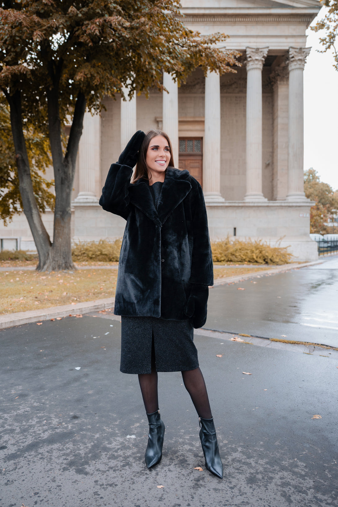 Táto čierna bunda s límcom a zapínaním na cvoky je dokonalou voľbou pre štýlové jesenné outfity. Má voľný strih, ktorý poskytuje pohodlie a voľnosť pri nosení, pričom pôsobí elegantne a moderne. Vyrobená je z mäkkého, príjemného materiálu s krátkymi chĺpkami, ktorý zaručuje hrejivosť a zároveň dodáva luxusný vzhľad. Dĺžka po kolená robí z tejto bundy praktický a vkusný kúsok, ktorý ochráni pred chladom a zároveň zvýrazní ženskú siluetu. Klasická čierna farba je nadčasová a ľahko kombinovateľná, vďaka čomu sa bunda hodí k bežným aj elegantnejším outfitom.